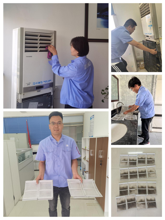 在活動現場,志愿者們分工明確,配合密切,拆卸空調外殼、清洗空調濾網、擦拭空調外機,經過一下午有條不紊的清洗活動,辦公室和會議室的空調從內到外煥然一新。“沒想到空調濾網這么臟”“太好了,終于能放心開空調了”,看著沖洗出的灰塵污漬,員工們對志愿者助人為樂、無私奉獻的精神紛紛表示感謝和贊揚。